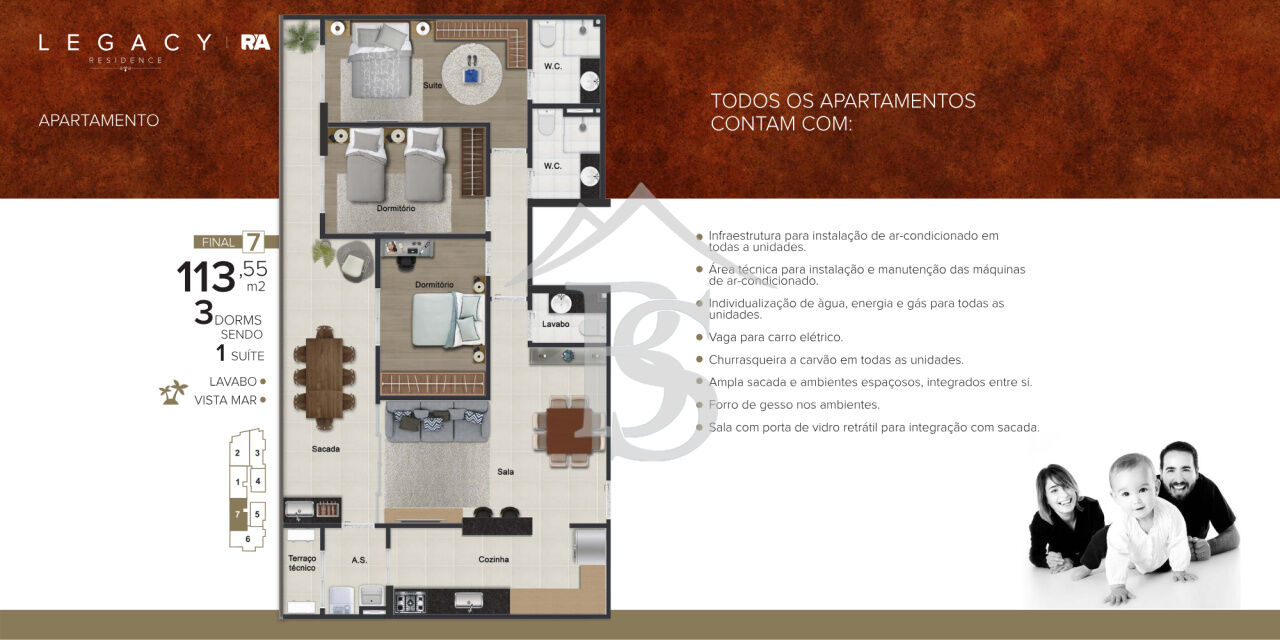 Unidades Final 7 contam com 113 m², três dormitórios (sendo uma su...